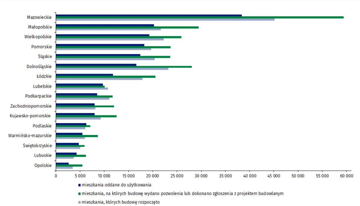 "W 2024 r. najwięcej mieszkań oddanych do użytkowania, mieszkań, których budowę rozpoczęto oraz na których budowę wydano pozwolenia lub dokonano zgłoszenia z projektem budowlanym, odnotowano w województwie mazowieckim (odpowiednio: 38,4 tys., 45,2 tys., 59,4 tys. mieszkań). Wysokie wartości wystąpiły również w województwach: małopolskim (20,2 tys., 21,7 tys. i 29,5 tys.), dolnośląskim (16,6 tys., 23,2 tys. i 28,1 tys.) oraz wielkopolskim (19,3 tys., 22,3 tys. i 25,9 tys.)" - podał GUS.