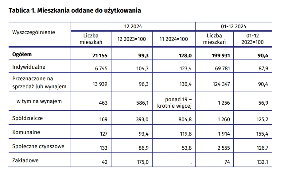 W minionym roku do użytkowania oddano niecałe 200 tys. mieszkań - to spadek o niemal jedną dziesiątą w stosunku do roku 2023. O tyle samo spadła też liczba mieszkań przekazanych przez deweloperów do eksploatacji (124,3 tys.), jeszcze bardziej zmalała liczba mieszkań oddanych przez inwestorów indywidualnych - o 12,1 proc. (69,8 tys.).