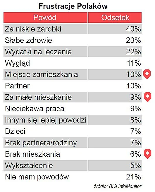 Najbardziej zaskakuje ostatnia deklaracja związana z mieszkaniem - na brak własnego lokum narzeka zaledwie 6 proc. badanych. Dużo bardziej istotne problemy dla Polaków to niska pensja, zdrowie i przeszkody osobiste związane z relacjami w domu i pracy. Niski odsetek badanych narzekających na brak własnego M jest o tyle ciekawy, że według statystyk Eurostatu, wyjątkowo późno, na tle Europy, wyprowadzają się od swoich rodziców. Dzieje się to w wieku 27,7 lat, podczas gdy unijna średnia to 26 lat.