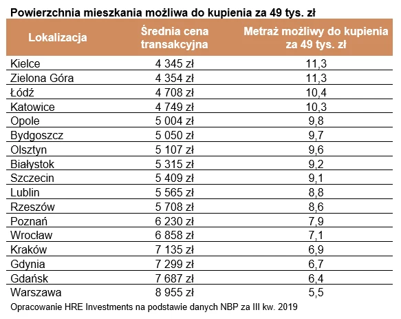 Sprawdziliśmy więc, ile dodatkowych metrów mieszkania można kupić dzięki większej kwocie kredytu. Biorąc pod uwagę ceny transakcyjne opublikowane przez bank centralny za 3 kwartał 2019 roku. Wynika z nich, że kwotę 49 tysięcy złotych moglibyśmy zamienić na od 5,5 do nawet 11,3 m kw. Najwyższe wyniki zanotowano w Katowicach, Kielcach, Zielonej Górze i Łodzi, gdzie poziom cen transakcyjnych nieruchomości używanych jest najniższy w gronie badanych miast. Metr przeciętnych "czterech kątów" znajdował tam nabywcę za od 4,3 do 4,7 tys. zł. W efekcie dodatkowa kwota może nawet wystarczyć na dodatkowy skromny pokój. Najmniej za 49 tys. zł można kupić w Krakowie, Gdyni, Gdańsku i Warszawie. W każdym z tych miast możliwości nabywcze nie przekraczają 7 metrów.
