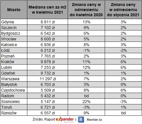 Metodologia raportu: Podane ceny mieszkań to mediany, które wyliczono na podstawie analizy 54 461 ogłoszeń sprzedaży dostępnych w internecie w kwietniu 2021 r. Wartości są publikowane tylko dla rynków, na których liczba ogłoszeń przekracza 100. Od kwietnia 2021 r. grupę analizowanych miast rozszerzyliśmy o Rzeszów.