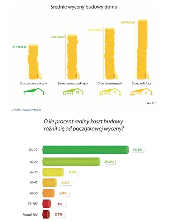 Przeprowadzone przez Oferteo.pl pogłębione wywiady ankietowe pozwoliły na oszacowanie kosztów budowy statystycznego domu w zależności od stanu wykończenia. Oddanie domu w stanie surowym otwartym, na który decyduje się co czwarty inwestor (25,1%), to koszt rzędu 210 000 zł, a dołożenie okien i drzwi zwiększa koszt do 270 000 zł.