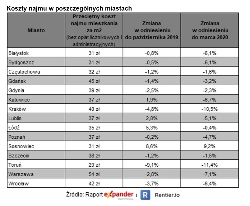 Koszty najmu już niemal we wszystkich analizowanych przez nas miastach są niższe niż w marcu, czyli na początku pandemii. Wzrosły jedynie w Sosnowcu, ale to tak naprawdę efekt wyjątkowo niskich poziomów w marcu. Był to jedyny miesiąc w tym roku kiedy średnia spadła tam poniżej 30 zł za m kw. W rzeczywistości tam również obserwujemy spadki. Jeszcze w lipcu średni koszt najmu w Sosnowcu wynosił niecałe 33 zł za m kw., a obecnie 30,57 zł. Przy okazji warto też wspomnieć o sytuacji na największym rynku najmu, czyli w Warszawie. Średni koszt najmu wynosi tam 54 zł za m kw. i jest to o 7,1 proc. mniej niż w marcu.