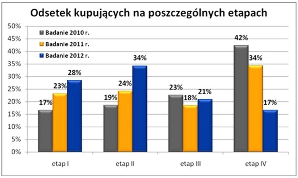 Mniejszą popularnością cieszą się natomiast mieszkania w inwestycjach ukończonych. Udział mieszkań sprzedanych na tym etapie zaawansowania robót spadł z 42 proc. w 2010 roku do 34 proc. w 2011 roku i 17 proc. obecnie. Tym samym 2012 rok jest pierwszym, w którym odsetek kupujących decydujących się na mieszkanie oddane do użytkowania nie był najwyższy wśród wszystkich czterech wyodrębnionych grup. Co więcej omawiany wynik jest wśród nich najniższy. Obecnie dominującą grupą są osoby wybierające mieszkanie na drugim etapie budowy, a więc od stanu zerowego do stanu surowego zamkniętego z elewacją. Decydując się na lokal już gotowy zazwyczaj można wybierać z niewielkiej puli pozostałych do sprzedania mieszkań. Z drugiej jednak strony, gdy deweloperowi zależy na zamknięciu danego projektu i chce uniknąć kosztów utrzymania niesprzedanych nieruchomości, może zaoferować atrakcyjne rabaty. Ponadto zakup gotowego mieszkania od dewelopera jest mało ryzykowny.