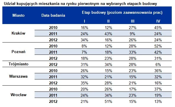 Trzeba także zauważyć, że odsetek kupujących mieszkania na poszczególnych etapach budowy kształtuje się różnie, w zależności od miasta. W Warszawie, Trójmieście i Krakowie nawet co trzecie mieszkanie deweloperskie sprzedane było na pierwszym etapie zaawansowania, czyli zanim jeszcze inwestycja "wyszła" nad ziemię. Takie wyniki są konsekwencją dużej liczby rozpoczynanych inwestycji, cen nowych mieszkań, przyzwyczajeń nabywców oraz tego, że aby kupić mieszkanie o relatywnie małym metrażu zazwyczaj trzeba trafić do dewelopera na wczesnym etapie realizacji projektu.
