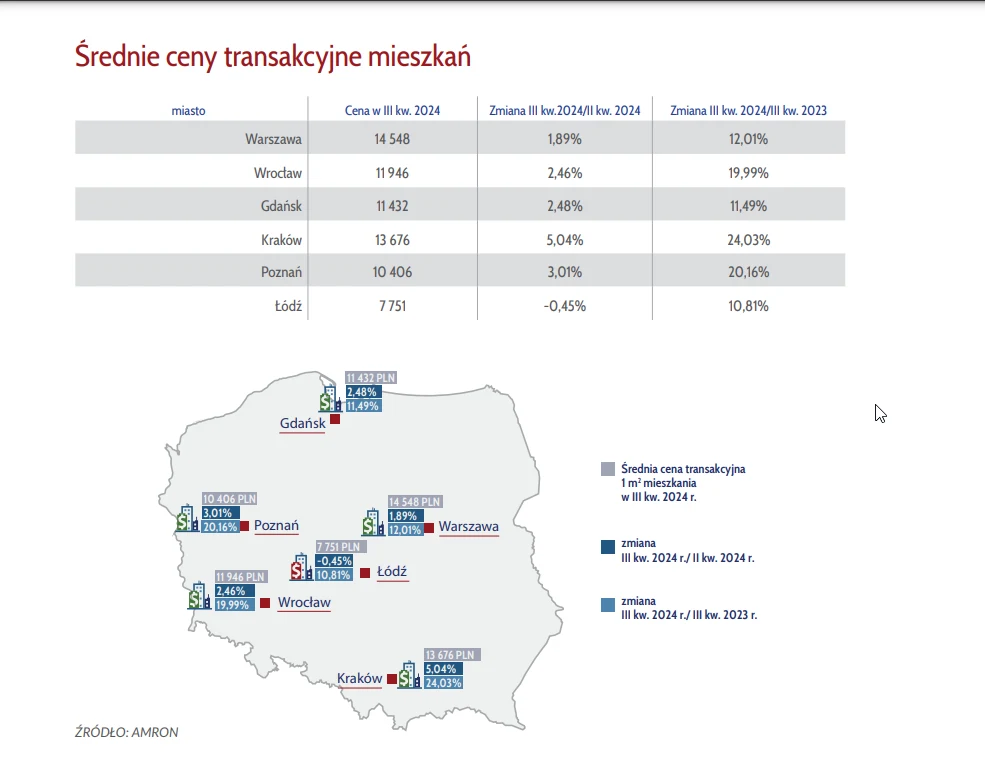- W trzecim kwartale 2024 roku wysoki poziom wzrostu cen odnotowano w Krakowie - o 5 proc. Średnia cena transakcyjna w Poznaniu wzrosła o 3 proc., w Gdańsku i Poznaniu o ok. 2,5 proc. a w Warszawie już tylko o 1,89 proc. w porównaniu do drugiego kwartału 2024 roku. Symboliczny spadek ceny transakcyjnej odnotowano natomiast w Łodzi - o 0,45 proc. - Niektórzy analitycy rynku mieszkaniowego wieszczą nawet nadchodzący spadek cen mieszkań. Na razie jednak obniżki dotyczą jedynie cen ofertowych - informują autorzy raportu AMRON.