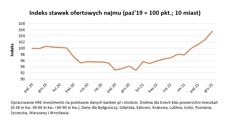 W ciągu ostatnich 12 miesięcy stawki w największych miastach poszły w górę o 12 proc. Dopiero w danych za kolejne miesiące zobaczymy, jaki efekt na rynku najmu da obecna fala zachorowań i np. rezygnacja części uczelni z tradycyjnej nauki. Póki co wpływ ten nie powinien być porównywalny z tymi, który obserwowaliśmy w 2020 roku, bo niestacjonarny tryb zajęć tym razem ma być czasowy (np. do końca lutego).