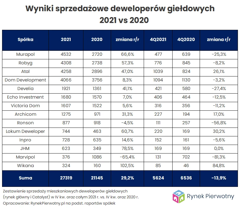 Według ekspertów portalu RynekPierwotny.pl taki stan rzeczy zawdzięczamy jak wiadomo popytowej erupcji na mieszkaniowym rynku pierwotnym, wykreowanej głównie przez inwestorów indywidualnych, spekulantów i fundusze PRS. To dzięki tym ostatnim na pozycji lidera rocznej kontraktacji znalazł się Murapol, spółka od dawna aspirująca do najwyższego miejsca na branżowym podium. Swoje zrobiły też prawie zerowe przez większą część ub. roku stopy procentowe i niespełnione obietnice prezesa NBP utrzymania ich jeszcze przez długie kwartały.