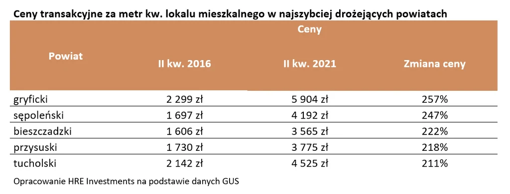 Równie wysoko, bo prawie 2,5 raza wzrosły ceny w powiecie sępoleńskim w kujawsko-pomorskim. Tu z kolei w 2016 roku chcąc kupić mieszkanie trzeba było się liczyć z wydatkiem rzędu 1,7 tys. zł za metr kw. Obecnie trzeba wydać prawie 4,2 tys. zł. Wśród jednostek samorządowych, w których ceny się podwoiły, znajdziemy również powiaty bieszczadzki (podkarpackie), przysuski (mazowieckie) czy tucholski (kujawsko-pomorskie).