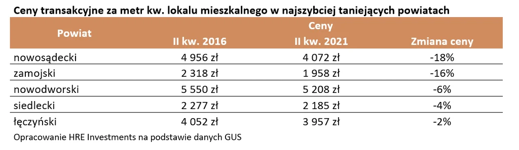 Na drugim biegunie znajdziemy za to powiaty, w których mieszkania w trakcie ostatnich pięciu lat staniały. W tym gronie rekordzistą okazuje się być powiat nowosądecki (woj. małopolskie). Jeszcze w drugim kwartale 2016 roku ktoś, kto chciał kupić tam mieszkanie za metr kwadratowy, musiał zapłacić przeciętnie aż prawie 5 tys. zł. Zgodnie z najnowszymi danymi (za II kwartał 2021 roku) stawka ta zmniejszyła się o 18 proc. i wynosi 4,1 tys. zł za metr. Drugim najszybciej taniejącym powiatem w Polsce jest powiat zamojski na Mazowszu. Tutaj analogiczne kwoty wynoszą 2,3 tys. zł oraz 1,9 tys. zł. Oznacza to, że w powiecie zamojskim cena transakcyjna za m kw. mieszkania spadła w horyzoncie pięcioletnim o 16 proc.