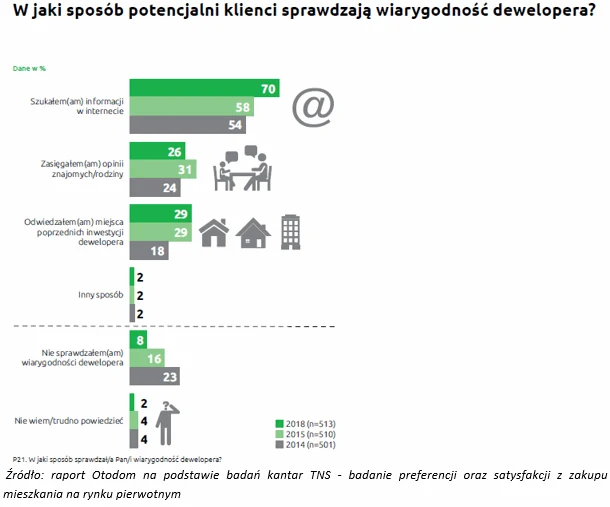 W raporcie serwisu Otodom pojawił się również temat dotyczący samych deweloperów oraz metod sprawdzania ich wiarygodności. Okazuje się, że przeważająca część ankietowanych, bo aż 92 procent, przed zakupem mieszkania postanowiło sprawdzić dewelopera. 70 procent ankietowanych szukało informacji o deweloperze w internecie. Jest to znaczny wzrost w porównaniu z latami 2015 i 2014, gdy z tej formy skorzystało odpowiednio 58 i 54 procent respondentów.