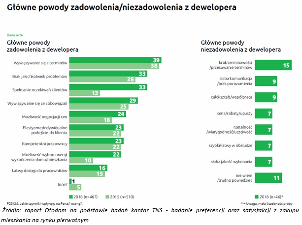 Ankietowani przy ocenie deweloperów wyróżnili przede wszystkim takie czynniki jak wywiązywanie się z terminów (39 proc. odpowiedzi), docenili także brak problemów oraz spełnienie przez dewelopera ich oczekiwań (po 33 proc. wskazań). Wśród nielicznych powodów niezadowolenia dominował brak terminowości, słaba komunikacja oraz całokształt współpracy.