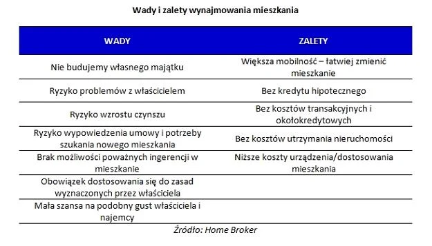 Trzeba jednak pamiętać, że najem ma też całkiem sporo wad. Wśród tych najczęściej podnoszonych jest fakt, że zamiast budować własny majątek, pozwalamy go gromadzić właścicielowi mieszkania. Po 30 latach wynajmowania mieszkania niczego nie będziemy mieli, po spłacie kredytu hipotecznego mamy zaś akt własności mieszkania, które można np. sprzedać.