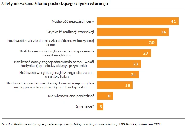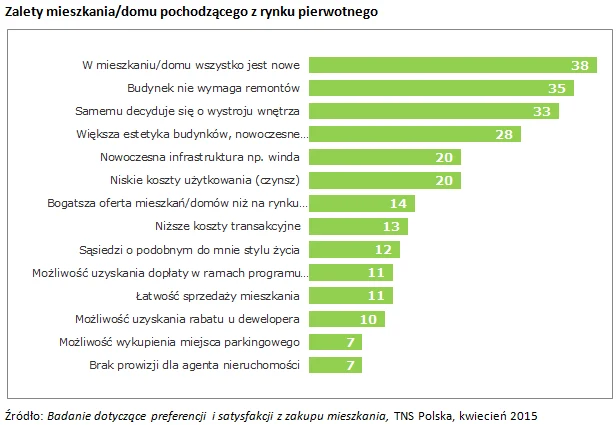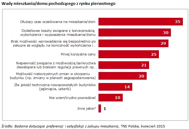 W ramach "Badania dotyczącego preferencji i satysfakcji z zakupu mieszkania" przeprowadzonego przez TNS Polska dla serwisu Otodom.pl na grupie 510 osób, zapytano respondentów dlaczego są bardziej skłonni kupić mieszkanie lub dom na rynku pierwotnym. Poniższy wykres prezentuje wyniki.
