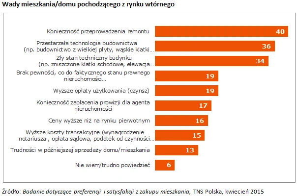 Z kolei największą wadą mieszkań z rynku wtórnego jest konieczność przeprowadzenia remontu (zdaniem 40 proc. respondentów). Jest to związane z dodatkowymi kosztami, a także czasem, który trzeba na to poświęcić, a to z kolei eliminuje możliwość natychmiastowego wprowadzenia się do kupionego mieszkania/domu. Dwie kolejne cechy wskazane jako wady to przestarzała technologia budownictwa (36 proc.) oraz zły stan techniczny budynku (34 proc.).