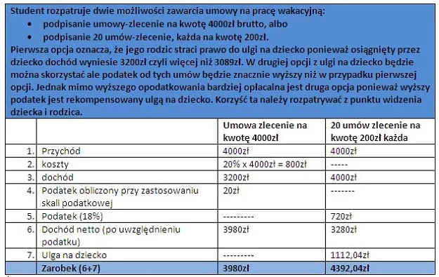 Jeśli więc dziecko uczące się chce podjąć wakacyjną pracę i ma świadomość, że jego dochód przekroczy 3089zł , powinien rozważyć podpisanie nawet kilkunastu umów opiewających na kwotę maksymalnie 200zł. Dzięki temu rodzic nie straci możliwości skorzystania z ulgi na dziecko i preferencyjnego opodatkowania dochodu.