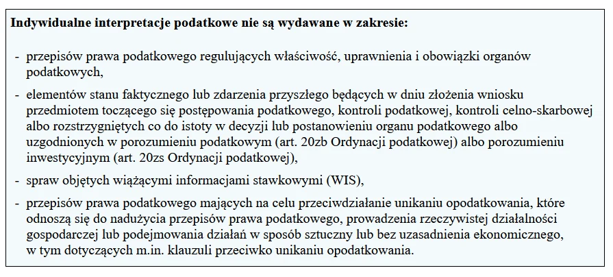 Wyjaśnienia mogą dotyczyć zaistniałego już stanu faktycznego lub zdarzenia przyszłego. Wolno pytać o sposób stosowania w jednostkowej sprawie przepisów podatkowych rozumianych jako przepisy ustaw podatkowych i wydawanych na ich podstawie aktów wykonawczych, a także postanowień ratyfikowanych przez Polskę: umów o unikaniu podwójnego opodatkowania oraz innych umów międzynarodowych dotyczących problematyki podatkowej. Wiele kwestii zostało jednak wyłączonych z zakresu interpretacji podatkowych (patrz ramka).