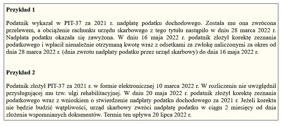 Rezultatem dokonania korekty zeznania podatkowego może być także konieczność oddania całej lub części otrzymanej już nadpłaty podatku dochodowego. Nadpłata wykazana nienależnie lub w zawyżonej wysokości, którą urząd skarbowy zwrócił podatnikowi, jest traktowana jako zaległość podatkowa. Kwotę niesłusznie otrzymaną - całą nadpłatę podatku albo różnicę między nadpłatą wynikającą z pierwotnego zeznania podatkowego a nadpłatą przysługującą po korekcie rozliczenia - należy oddać wraz z odsetkami za zwłokę. Nalicza się je za okres od dnia zwrotu nadpłaty podatku przez urząd skarbowy do dnia wpłaty równowartości nienależnie otrzymanej kwoty (przykład 1).