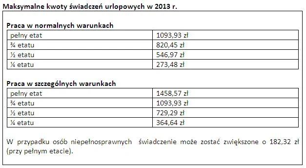 Maksymalne świadczenia urlopowe wynosi dokładnie 1093,93 zł - taką kwotę może otrzymać pracownik, który jest zatrudniony na pełnym etacie (przy czym dany pracodawca może zdecydować o wypłaceniu niższej kwoty). Przy niższym wymiarze pracy, na przykład trzy czwarte etatu, kwota maksymalnego świadczenia urlopowego odpowiednio się obniża - w tym wypadku do ok. 820 złotych. W przypadku wykonywania pracy w szczególnych warunkach lub o szczególnym charakterze (np. pod ziemią) maksymalna kwota świadczenia dla osób na pełnym etacie wynosi 1458,57 złotych.