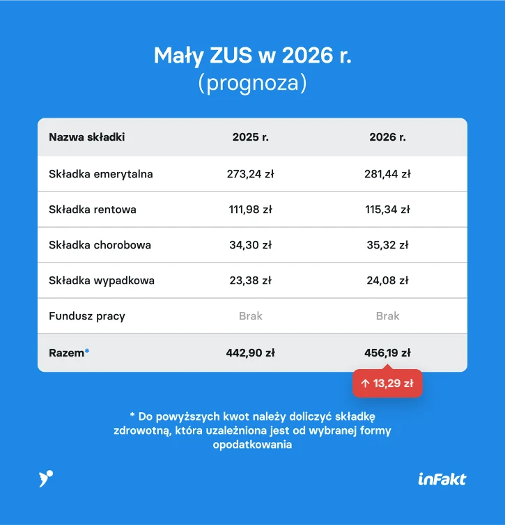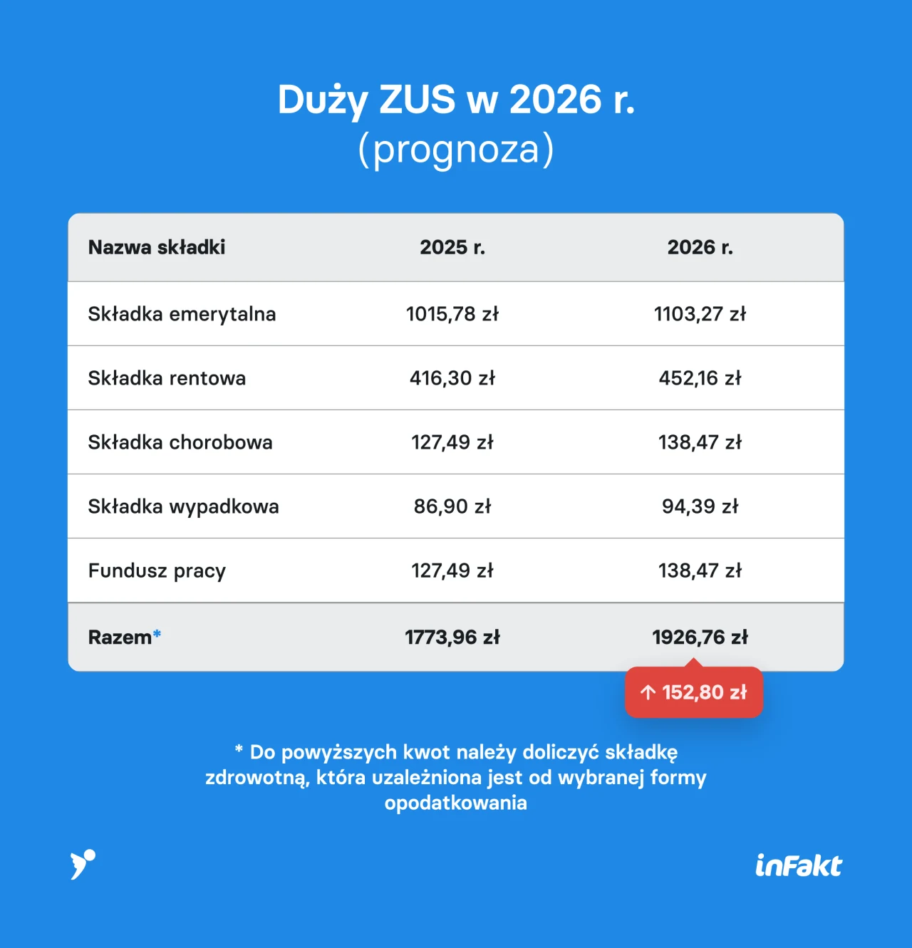 Podstawa wysokości składek ZUS dla przedsiębiorców to 60 proc. prognozowanej średniej krajowej. - Przy zaktualizowanej prognozie rządu, ta podstawa mogłaby wyniesie 5652 zł. W konsekwencji składki ZUS na rok 2026 wynosiłyby 1926,76 zł (bez składki zdrowotnej, naliczanej osobno w zależności od wybranej formy opodatkowania). W roku 2025 składki wynoszą 1773,96 zł. Oznaczałoby to wzrost - o 152,80 zł miesięcznie. Na ostateczną kwotę prognozowanego przeciętnego wynagrodzenia musimy jeszcze poczekać do ustawy budżetowej, ale nawet jeśli będzie inna, to z pewnością nie będzie to duża zmiana - przewiduje Piotr Juszczyk, główny doradca podatkowy InFakt.