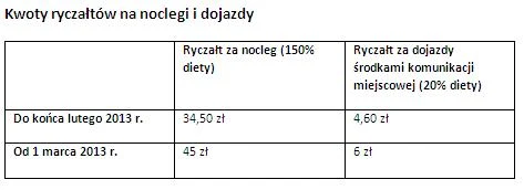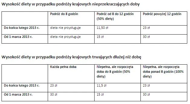 Rozporządzenie Ministra Pracy i Polityki Socjalnej z dnia 29 stycznia 2013 r. w sprawie należności przysługujących pracownikowi zatrudnionemu w państwowej lub samorządowej jednostce sfery budżetowej z tytułu podróży służbowej (wchodzi w życie 1 marca 2013 r.) zastąpi dwa obowiązujące obecnie rozporządzenia w sprawie diet - jedno z nich reguluje kwestie służbowych podróży krajowych, a drugie - zagranicznych. W nowym rozporządzeniu połączono przepisy wynikające z obydwu obecnych rozporządzeń. Stawki diet i kwoty limitów za nocleg przy podróżach zagranicznych także zostały podwyższone, ale w tym przypadku podwyżka zależy od danego kraju. Przykładowo dieta za podróż służbową do Niemiec wzrosła z 42 do 49 euro, a kwota limitu na nocleg - ze 103 do 150 euro. Z kolei diety za podróż służbową do Wielkiej Brytanii wzrosły z 32 funtów brytyjskich do 35 funtów, natomiast limit za nocleg w tym kraju - ze 140 do 200 funtów.