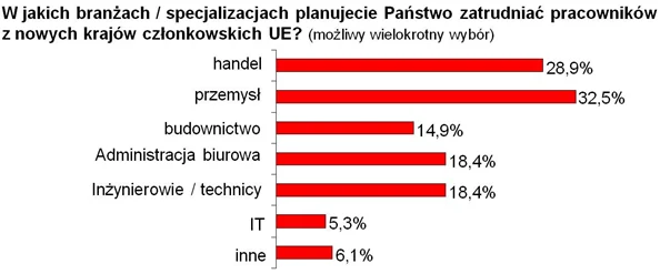 Największe zapotrzebowanie na pracowników występuje w przemyśle i handlu. Aż 32,5% badanych przedsiębiorstw wskazało przemysł jako branżę/specjalizację, w której planuje zatrudnienie pracowników z nowych krajów UE. Branżę handlową wskazało aż 28,9% przedsiębiorstw austriackich.