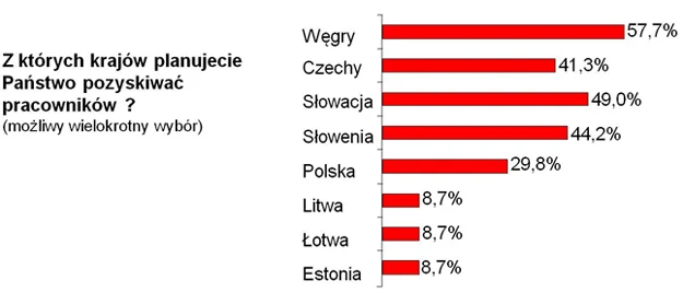 Wśród przebadanych przez Agencję Zatrudnienia Trenkwalder przedsiębiorstw największym zainteresowaniem cieszą się pracownicy z krajów położonych najbliżej Austrii. Ponad 40% badanych wskazało Węgry, Słowację, Słowenię i Czechy jako najbardziej interesujące do pozyskania personelu. Polska znalazła się dopiero na miejscu 5. Niemalże 30% badanych wskazało nasz kraj jako interesujące źródło pracowników.