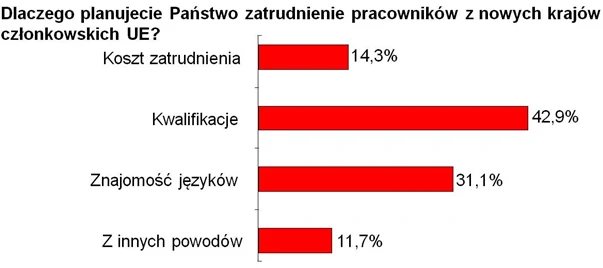 Z przeprowadzonego badania wynika, że wbrew panującemu przeświadczeniu, to nie koszty zatrudnienia są najważniejsze dla zagranicznych pracodawców. Aż 42,9% badanych firm uznało kwalifikacje jako najważniejszy powód zatrudniania pracowników z nowych krajów UE. Jednocześnie tylko 14,3% przedsiębiorstw wskazało na koszty zatrudnienia. Ważnym elementem jest również znajomość języków, którą wyróżnia aż 31,1% badanych firm.