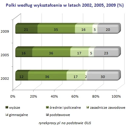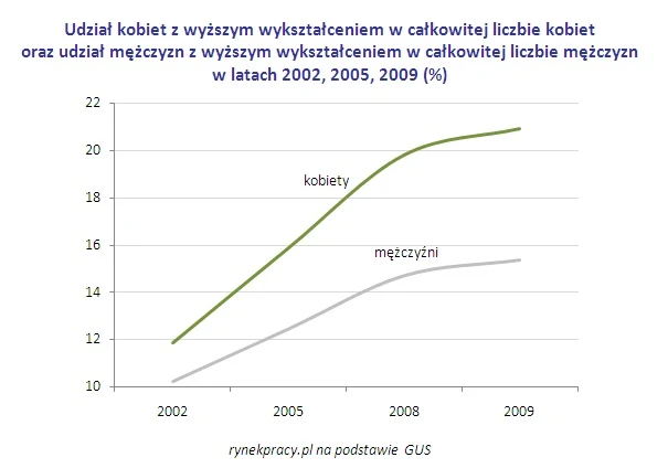 Z roku na rok rośnie liczba pań z wyższym wykształceniem. Jak wynika z danych Głównego Urzędu Statystycznego, w 2002 roku na 16,9 mln Polek aż 2 mln posiadało dyplom szkoły wyższej (12 proc.). W roku 2009 było to już 3,6 mln na 17 mln (21 proc.).