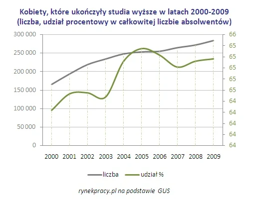 W latach 2000-2009 liczba absolwentów płci żeńskiej wzrosła o 71 proc. O ile w 2000 roku na rynek pracy wypłynęło 166 tys. absolwentek uczelni, o tyle w 2009 roku było to już 284,5 tys. Wzrost liczby mężczyzn kończących studia był nieco niższy i wyniósł 65 proc.