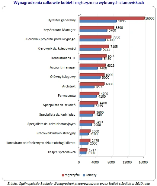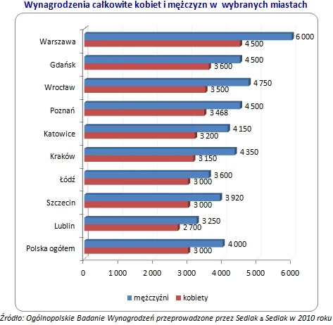 Jak w 2010 roku wyglądały płace kobiet i mężczyzn w naszym kraju? Średnia wyliczona dla wszystkich zawodów wskazuje, że zarobki Polek są o 1/3 niższe niż Polaków. W Krakowie mężczyznom płacono średnio o 38 proc. więcej, w Warszawie o 1/3, w Poznaniu i Katowicach różnica wyniosła 30 proc., a o 1/5 więcej od kobiet zarabiali panowie pracujący w Łodzi i Lublinie. Wiele mówiący, bo dotyczący zawodów z najwyższej półki, jest przykład stanowisko dyrektora generalnego, na którym mężczyźni zarabiali aż o 76 proc. więcej niż kobiety! Mężczyźni na tym stanowisku zarabiali 16 000 zł brutto, gdy ich koleżanki 9095 zł.