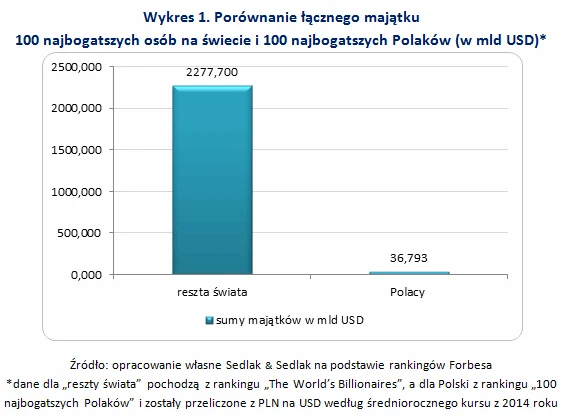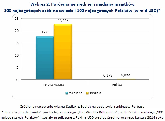 W 2014 roku przeciętny majątek stu najzamożniejszych Polaków to około 368 mln dolarów. Natomiast dorobek najbogatszych ludzi na świecie średnio wyniósł 22,7 mld dolarów, co daje kwotę ponad 62 razy większą. Mediana majątków wynosi 178 mln dolarów w przypadku Polaków i 17,8 mld dolarów dla reszty świata, co stanowi równo 100-krotnie większą wartość.