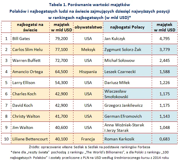 Dla porównania majątek najbogatszego człowieka, czyli Billa Gatesa, jest szacowany na około 79,2 mld dolarów, natomiast dobytek pierwszego z listy Polaka, Jana Kulczyka wynosi 4,7 mld dolarów, co stanowi niecałe 6 proc. majątku Gatesa. Dziesiątkę najbogatszych świata zamyka pochodząca z Francji Liliane Bettencourt, z majątkiem 40,1 mld dolarów. Analogiczną pozycję w Polsce zajmuje Roman Karkosik, z dobytkiem wynoszącym 0,6 mld dolarów.