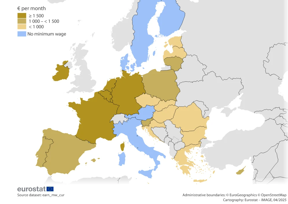 Z pierwszych danych dotyczących płacy minimalnej za 2025 roku wynika, że w 10 krajach Unii Europejskiej płaca minimalna wynosiła poniżej 1000 euro miesięcznie, w 6 innych krajach wahała się od 1000 do 1500 euro miesięcznie, a w pozostałych 6 krajach płaca minimalna przekraczała 1500 euro miesięcznie.