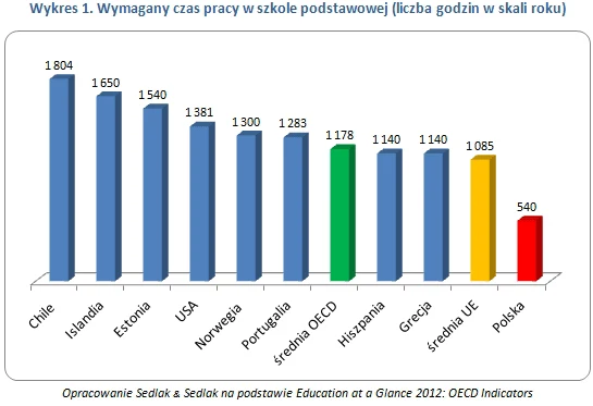 Jak pokazuje raport "Education at Glance 2012" przygotowany przez Organizację Współpracy Gospodarczej i Rozwoju (OECD) nauczyciele w Polsce pracują najkrócej spośród wszystkich najlepiej rozwiniętych gospodarek świata. Polscy pedagodzy mają też najniższy wymiar pensum. Według danych OECD nauczyciel szkoły podstawowej w Polsce prowadzi zajęcia dydaktyczne tylko przez 502 godziny rocznie, czyli przez ok. 162 minuty dziennie (co daje 3,5 godziny lekcyjnej). Średnia dla krajów OECD wynosi natomiast ponad 5,5 godziny lekcyjnej, a w Stanach Zjednoczonych nawet 8.