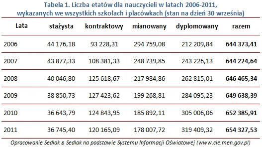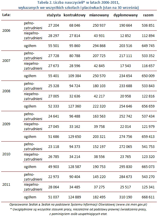 W ubiegłym roku szkolnym 2011/2012 w szkołach pracowało 668 611 pedagogów. Większość z nich była zatrudniona na pełny etat (543 270 osób), a pozostałe 125 341 mogło liczyć jedynie na niepełne zatrudnienie (odpowiednio 81 proc. i 19 proc.). W ciągu ostatnich kilku lat liczby te pozostają niemal bez zmian, z niewielką tendencją rosnącą. Dla porównania, ostatniego dnia września 2006 roku w szkołach było zatrudnionych 649 745 nauczycieli, z czego 536 851 na pełny etat, a 112 894 w niepełnym wymiarze zatrudnienia (83 proc. i 17 proc.).