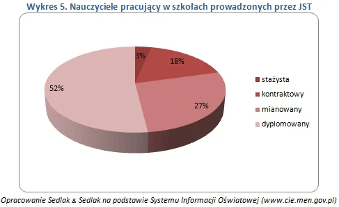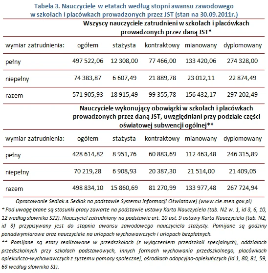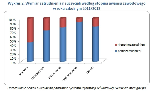W szkołach i placówkach dydaktycznych prowadzonych przez JST w roku szkolnym 2011/2012 pracowało niespełna 572 tys. pedagogów (nie uwzględniając nauczycieli na urlopach wychowawczych lub bezpłatnych). Prawie 500 tys. z nich w pełnym wymiarze zatrudnienia (ok. 87,5 proc.), a pozostałe 74 tys. w niepełnym wymiarze (ok. 12,5 proc.). Proporcje te różnią się jednak, gdy weźmie się pod uwagę stopień awansu zawodowego. Aż 22 proc. nauczycieli kontraktowych było zatrudnionych w niepełnym wymiarze czasowym. Jeszcze gorzej było w grupie stażystów, gdzie tylko 2/3 pracowało w pełnym wymiarze zatrudnienia. Inaczej było w przypadku nauczycieli dyplomowanych - zdecydowana większość z nich (ponad 92 proc.) była zatrudniona w pełnym wymiarze. Tylko proporcje w wymiarze zatrudnienia nauczycieli mianowanych odpowiadają ogólnej tendencji.