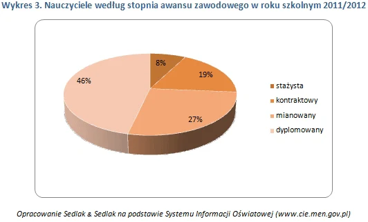 Prawie połowa nauczycieli zatrudnionych w roku szkolnym 2011/2012 osiągnęła najwyższy stopień awansu zawodowego, którym jest nauczyciel dyplomowany. 27 proc. pedagogów posiadało stopień nauczyciela mianowanego, zaś nauczyciele kontraktowi stanowili 19 proc. kadry pedagogicznej szkół. Nauczycieli stażystów było tylko 8 proc. spośród wszystkich pedagogów pracujących w szkołach.