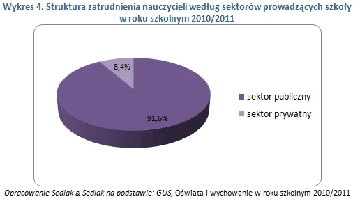 Zdecydowana większość nauczycieli jest zatrudniona w szkołach należących do sektora publicznego. Według danych GUS-u w roku szkolnym 2010/2011 w szkołach prowadzonych przez jednostki samorządu terytorialnego (JST) pracowało aż 91,6 proc. wszystkich nauczycieli, podczas gdy w sektorze prywatnym było zatrudnionych jedynie pozostałe 8,4 proc. pedagogów.