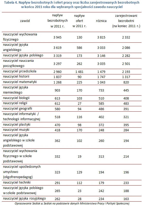 Spośród różnych specjalności nauczycielskich w 2011 roku grono bezrobotnych najliczniej zasilili nauczyciele wychowania fizycznego, których przybyło niespełna 4 tys. W tym samym czasie pojawiło się tylko 130 ofert pracy w tym zawodzie. Na koniec 2011 roku było zarejestrowanych 2,3 tys. nauczycieli WF pozostających bez zatrudnienia. Do grona bezrobotnych dołączyło również sporo nauczycieli nauczania początkowego (3297), języka polskiego (3319) oraz angielskiego (3619 osób). Dla tych ostatnich pojawiło się też stosunkowo dużo nowych ofert pracy (586). Ale i tak na koniec 2011 roku w urzędach pracy było zarejestrowanych ponad 2 tys. bezrobotnych nauczycieli angielskiego. Duża rotacja zachodzi też w gronie nauczycieli pracujących w przedszkolach: napływ bezrobotnych wyniósł prawie 3 tys., podczas gdy nowych ofert pracy było o połowę mniej. Dane dla wybranych pozostałych specjalności przedstawia tabela 4.