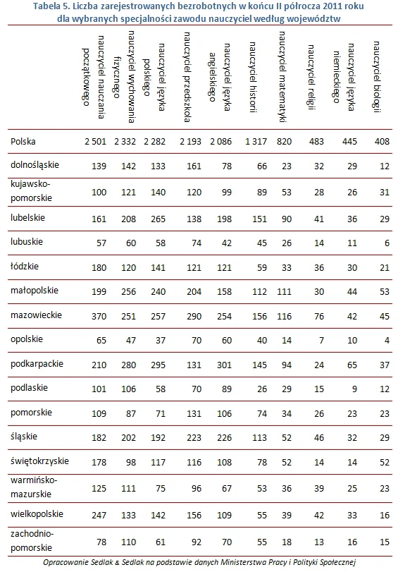 Na koniec 2011 roku najliczniejszą grupę spośród wszystkich zarejestrowanych bezrobotnych pedagogów stanowili nauczyciele nauczania początkowego - było ich 2,5 tys., z czego najwięcej w województwie mazowieckim (370 osób), wielkopolskim (247) i podkarpackim (210). Najmniej takich osób było w lubuskim (57), opolskim (65) i zachodnio-pomorskim (78). Trzeba jednak wziąć pod uwagę, że są to również najsłabiej zaludnione województwa. W pozostałych regionach liczba bezrobotnych nauczycieli nauczania początkowego zawierała się w przedziale 100-200.