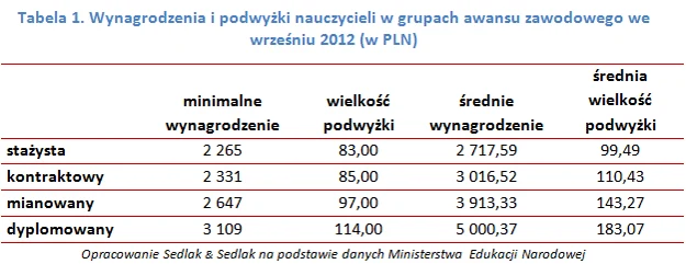 Wynagrodzenia polskich nauczycieli są na stosunkowo niskim poziomie w porównaniu z innymi krajami europejskimi. Jednak od 1 września 2012 roku sytuacja materialna pedagogów uległa nieznacznej poprawie. Podwyżki, jakie otrzymali, były ściśle powiązane ze szczeblem awansu zawodowego. W odniesieniu do wynagrodzeń zasadniczych nauczycieli z tytułem magistra i przygotowaniem pedagogicznym (95 proc. ogółu) wyniosły one odpowiednio: 83 zł dla nauczyciela stażysty, 85 zł kontraktowego, 97 zł mianowanego i 114 zł dyplomowanego miesięcznie.