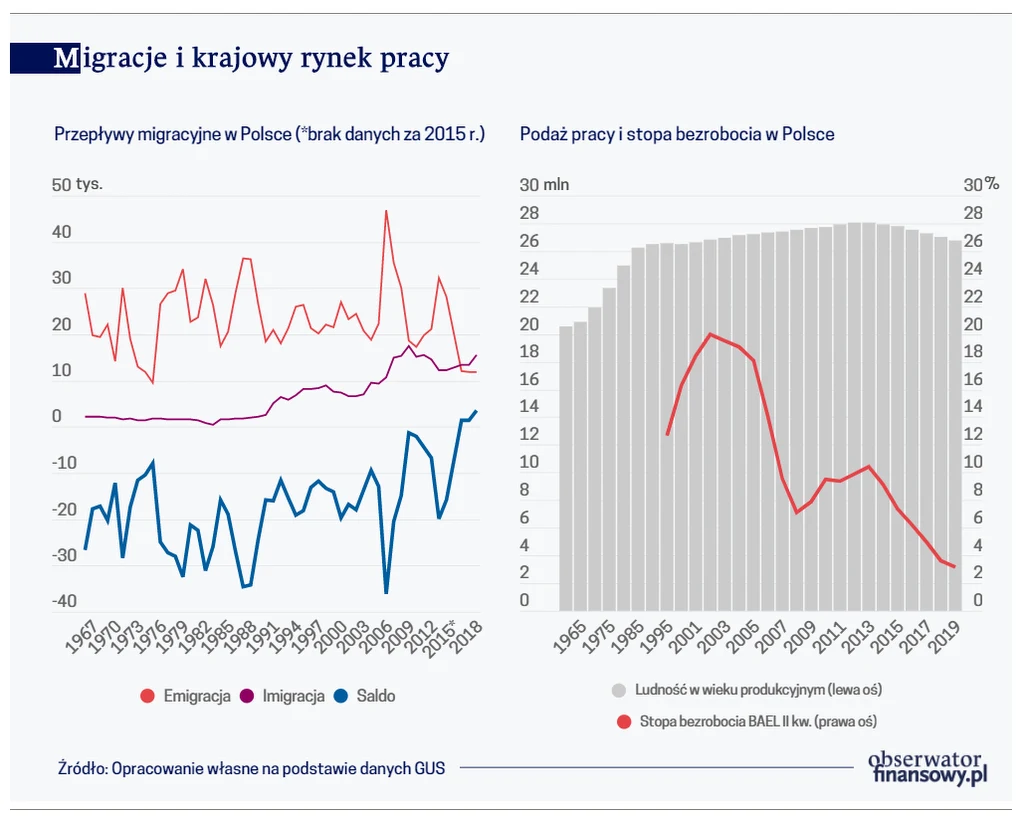 Jednocześnie do początków obecnej dekady polskie firmy nie miały na ogół problemów z rekrutacją pracowników. Liczba osób w tzw. wieku produkcyjnym (18-65 lat) systematycznie zwiększała się zresztą od końca II wojny światowej aż do 2012 roku. Liczne roczniki urodzone na początku lat 80. swoją karierę zawodową zaczynały na początku XXI wieku, gdy stopa bezrobocia sięgnęła 20 proc. a wśród młodzieży wynosiła powyżej 40 proc., a do jakiejkolwiek pracy zgłaszały się kolejki osób z dyplomami wyższych uczelni.