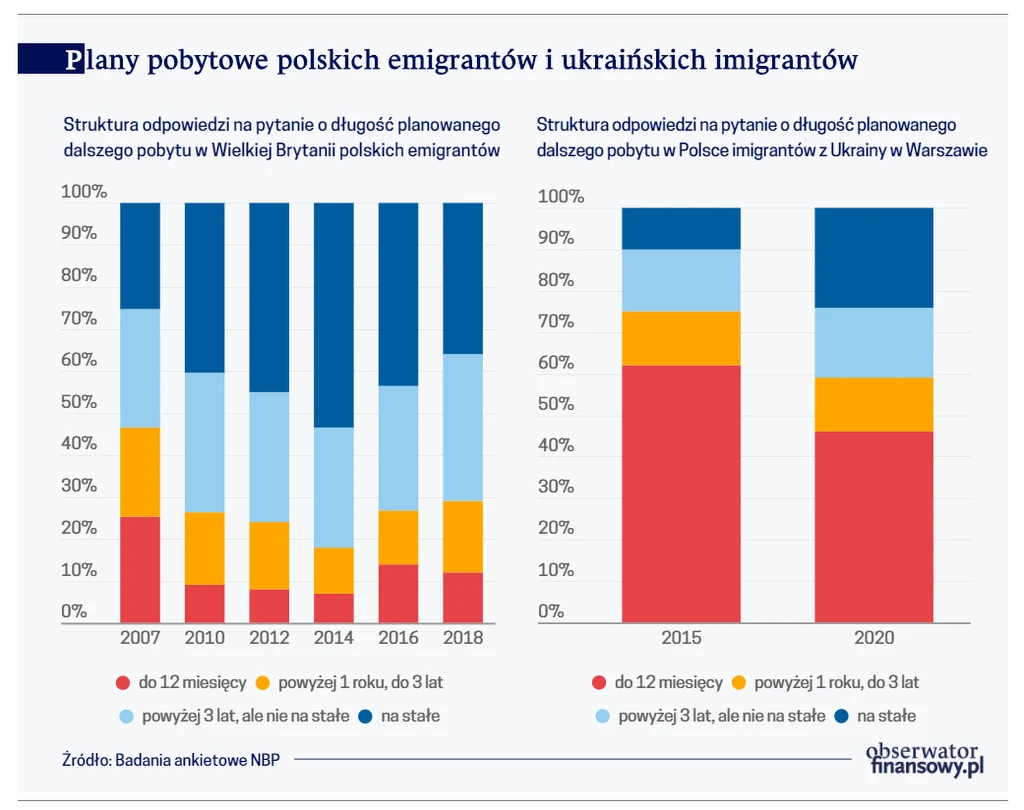 Po trzecie, od 2014 roku do Polski zaczęła napływać coraz liczniejsza imigracja z Ukrainy, a w ostatnich latach polski rynek pracy stał się atrakcyjny dla imigrantów zarobkowych z Białorusi oraz bardziej egzotycznych kierunków.Choć oficjalne statystyki nie dostrzegają dużej części przepływów, to nawet one wskazują na bezprecedensowe zmiany w ostatniej dekadzie. Polska z kraju emigracji w ciągu kilku lat stała się więc krajem, do którego napływ imigrantów z nawiązką równoważy coraz mniejszą emigrację własnych obywateli. Ten szczęśliwy zbieg okoliczności znacznie złagodził braki na polskim rynku pracy związane ze stopą bezrobocia. Przyczyniło się to do podtrzymania potencjału polskiej gospodarki w ostatnich latach, ale również zapobiegło powstawaniu nadmiernych i potencjalnie inflacjogennych napięć w gospodarce.Głównym powodem przyjazdów do Polski imigrantów z Ukrainy były względy ekonomiczne. Choć katalizatorem obecnych przepływów migracyjnych z Ukrainy do Polski jest konflikt militarny i część młodych ludzi przybyła do Polski z obaw o swoje bezpieczeństwo, to dla zdecydowanej większości motywacją była chęć poprawy bytu materialnego: różnice w wynagrodzeniach oraz bezrobocie wywołane przez kryzys ekonomiczny. Motywacje imigrantów ukraińskich są więc podobne jak dekadę wcześniej Polaków wyjeżdżających na Zachód. Podobieństw jest jednak więcej.Badania NBP pokazują, że pod względem przekazów pieniędzy do rodzin na Ukrainę imigranci zachowują się podobnie jak Polacy dekadę wcześniej w odniesieniu do środków wysyłanych do Polski. Pierwsi imigranci przyjeżdżali do kraju, o którym relatywnie mało wiedzieli i potrzebowali czasu, aby zaaklimatyzować się na nowym dla nich rynku pracy. Teraz wśród imigrantów z Ukrainy przeważają osoby przyjeżdżające z jasnym celem - zarabiać i wysyłać pieniądze do rodzinnego kraju. To właśnie te osoby najczęściej krążą pomiędzy Polską a Ukrainą i na razie akceptują taki model życia. Coraz więcej jest jednak imigrantów dążących do pozostania w Polsce na dłużej oraz przyjeżdżających z rodzinami. Podobnie jak to się działo w przypadku Polaków w Wielkiej Brytanii, czy Irlandii, osoby te coraz rzadziej wysyłają pieniądze na Ukrainę.Wszystko wskazuje na to, że podobnie jak Polacy w Europie Zachodniej, imigranci w Polsce coraz częściej będą dążyć do związania się na stałe z krajem, do którego wyemigrowali. W przypadku Polaków w Wielkiej Brytanii nawet zmiana regulacji w postaci brexitu nie doprowadziła do masowej migracji powrotnej, choć mniej ludzi zaczęło deklarować chęć pobytu na stałe. W przypadku imigracji z Ukrainy tymczasowość pobytów jest często wymuszona przez legalizację pobytu, niemniej także tutaj widać wydłużanie się planowanych pobytów w 2019 roku w porównaniu z badaniami sprzed 4 lat. Można zatem założyć, że w przypadku możliwego ograniczenia przepływów migracyjnych między Polską a Ukrainą w związku z COVID-19 ambitni młodzi ludzie dalej będą szukali możliwości pozostania i pracy w Polsce.