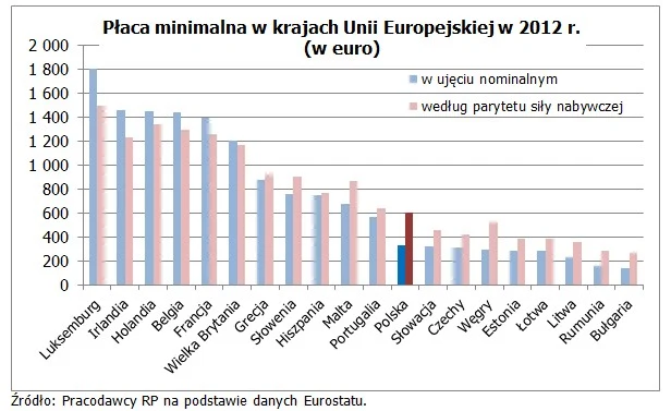 Pracodawcy RP przypominają, że zarówno w ujęciu nominalnym, jak i pod względem siły nabywczej wynagrodzenie minimalne jest w Polsce wyższe niż w krajach Grupy Wyszehradzkiej, krajach bałtyckich i wschodnio-bałkańskich. Wynosi ono 336,5 euro, zaś uwzględniając parytet siły nabywczej - 607 euro.