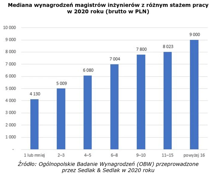 - Widzimy to w zestawieniach rynkowych, na przykład tych przygotowanych przez Sedlak&Sedlak. Magister inżynier z doświadczeniem nieprzekraczającym jednego roku może liczyć na medianę zarobków w wysokości 4130 zł. Doświadczenie 4-5 lat to już niemal 2000 zł więcej. Powyżej 16 lat doświadczenia daje z kolei medianę na poziomie 9000 zł.