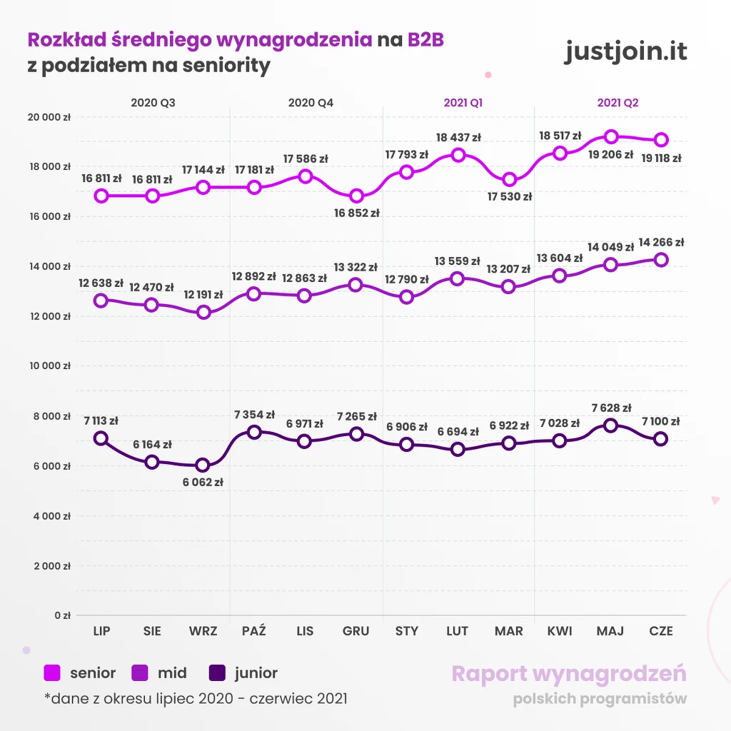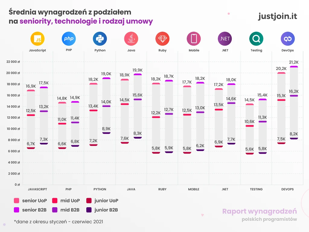 Raport, który opracowano na podstawie analizy 30 tys. ogłoszeń zamieszczonych na portalu Just Join IT w okresie styczeń-czerwiec 2021, pokazuje, że firmy szukały głównie pracowników na umowę o pracę (69 proc.), zaś ofert dla freelancerów (B2B) było 31 proc.. Ci ostatni otrzymali duże podwyżki względem roku 2020: junior 15 proc., mid 12,5 proc., senior 20 proc..