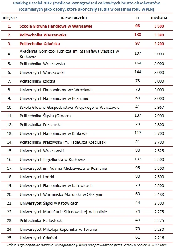 Jak wynika z Ogólnopolskiego Badania Wynagrodzeń, przeprowadzonego przez Sedlak & Sedlak w 2012 roku, najwyższe wynagrodzenie otrzymywały osoby, które ukończyły Szkołę Główną Handlową w Warszawie. Ich przeciętne zarobki wynosiły 3500 zł brutto. Na drugim miejscu uplasowała się Politechnika Warszawska. Absolwenci tej uczelni zarabiali w 2012 roku przeciętnie 3380 zł. Na trzecim miejscu w rankingu uczelni znalazła się Politechnika Gdańska. Osoby, które ukończyły studia na tej uczelni zarabiały 3200 zł.