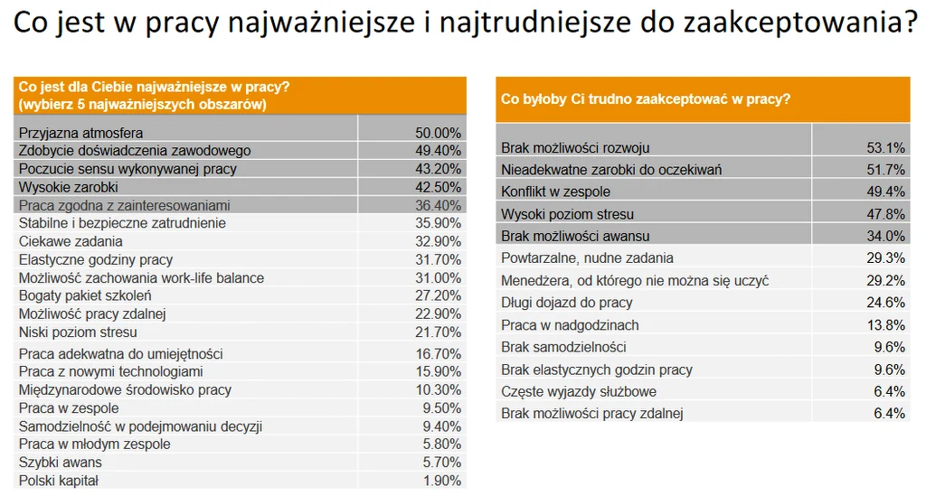 Połowa respondentów badania jako najważniejszy element w pracy wskazała przyjazną atmosferę (50%). Na kolejnych miejscach znalazły się: zdobycie doświadczenia zawodowego (49%), poczucie sensu wykonywanej pracy (43%), wysokie zarobki (42%) i praca zgodna z zainteresowaniami (36%). Z kolei na przeciwległym biegunie, jako elementy nie do zaakceptowania, młodzi wymienili: brak możliwości rozwoju (53%), zarobki nieadekwatne do oczekiwań (52%), konflikt w zespole (49%), wysoki poziom stresu (48%) i brak możliwości awansu (34%).