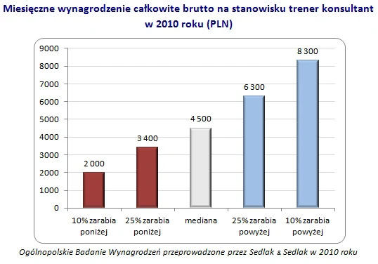 Zawód trenera postrzegany jest jako dobrze opłacane zajęcie. Potwierdzają to wyniki Ogólnopolskiego Badania Wynagrodzeń firmy Sedlak & Sedlak. W 2010 roku mediana płac trenerów konsultantów wyniosła 4500 zł. Oznacza to, że połowa badanych osób zarabiała powyżej, a połowa poniżej podanej kwoty. Co czwarty trener mógł liczyć na zarobki powyżej 6300 zł miesięcznie. U co dziesiątego miesięczne wynagrodzenie przekraczało 8300 zł.